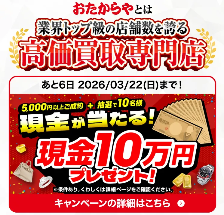 ![]() ・手数料+査定料 完全無料 ・買取金額 最大20%UP ・現金10万円 プレゼント |
