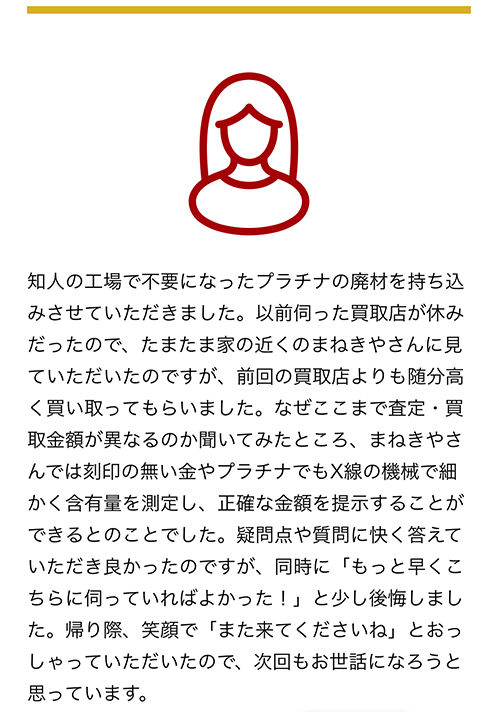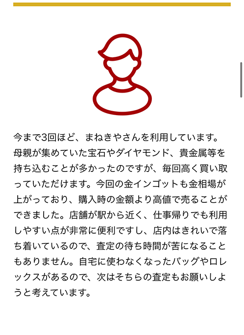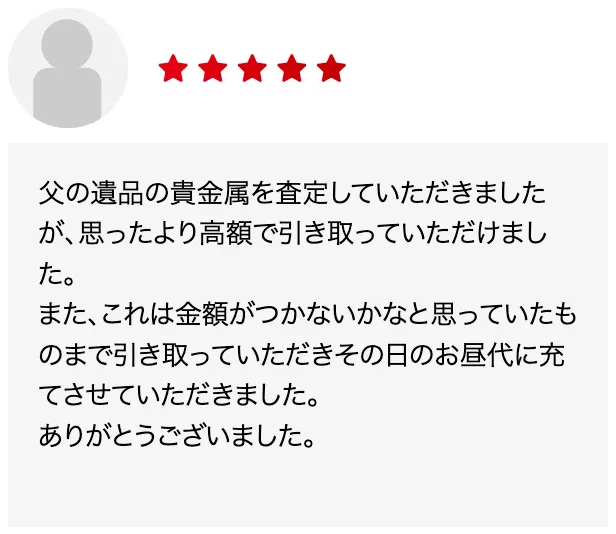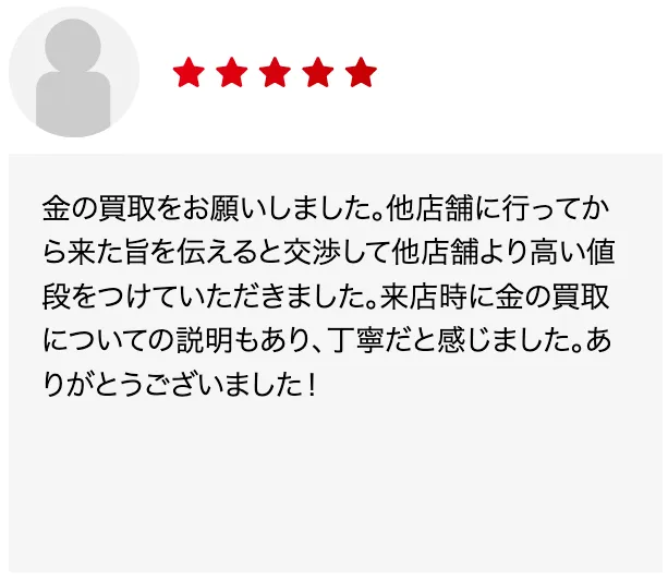 また、ブランド品・宝石・時計など幅白いジャンルの査定に対応しており、他店で断られた金でも買取可能なのが魅力です。