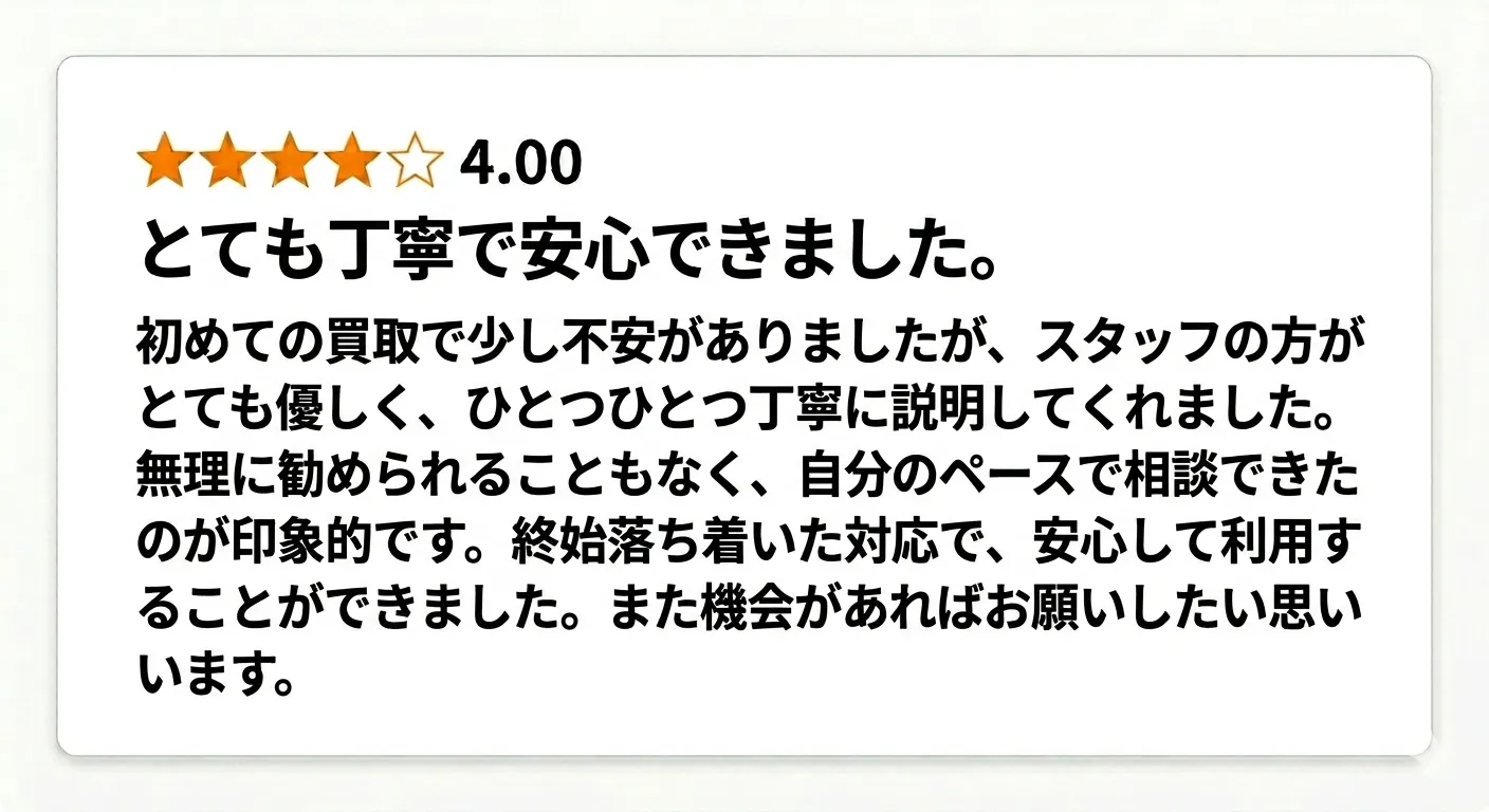 独自の厳しい基準に基づいた買取が行われており、初めての方でも安心して取引できる環境が整っています。